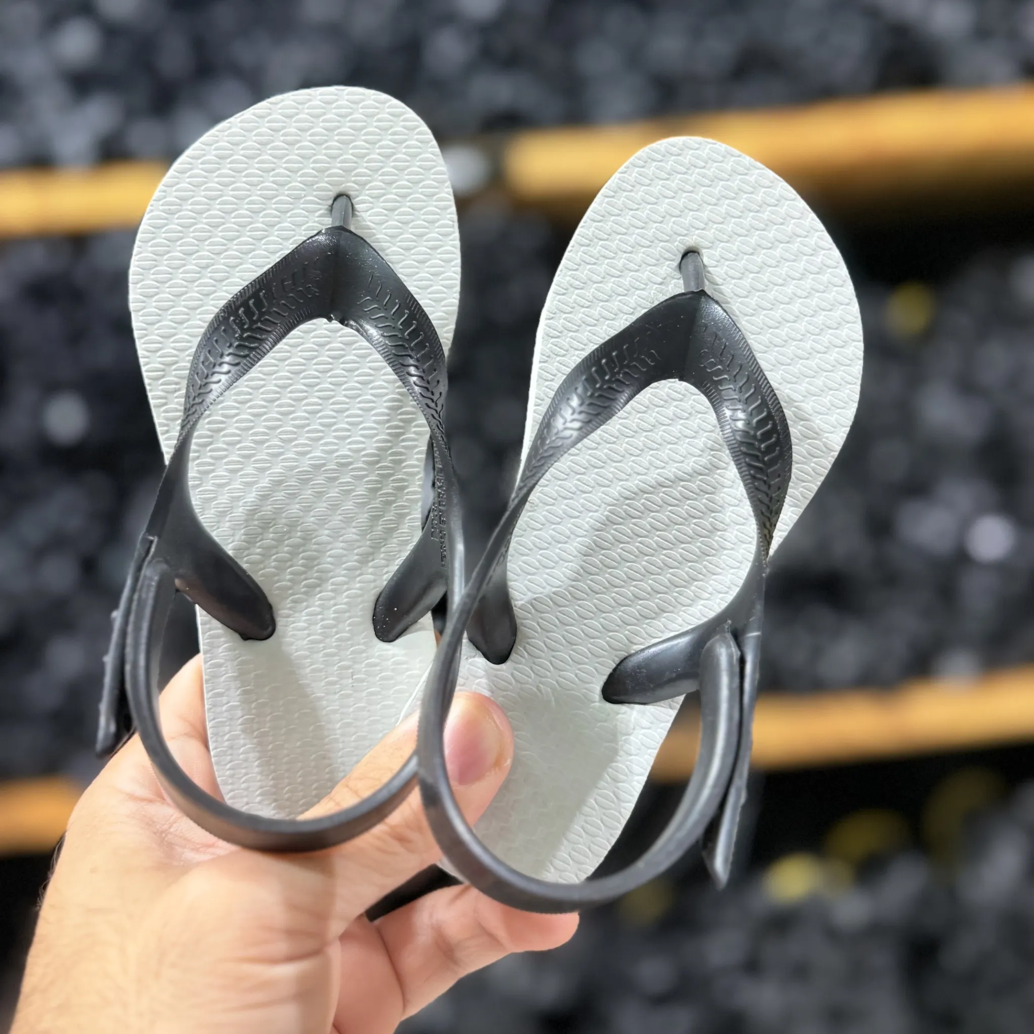 Ambas são fornecidas com suporte traseiro de PVC que ajuda a manter a alça ajustada no pezinho da criança.